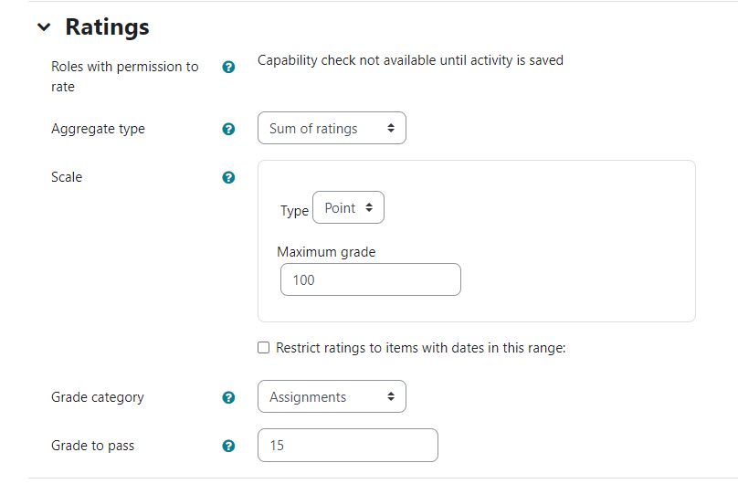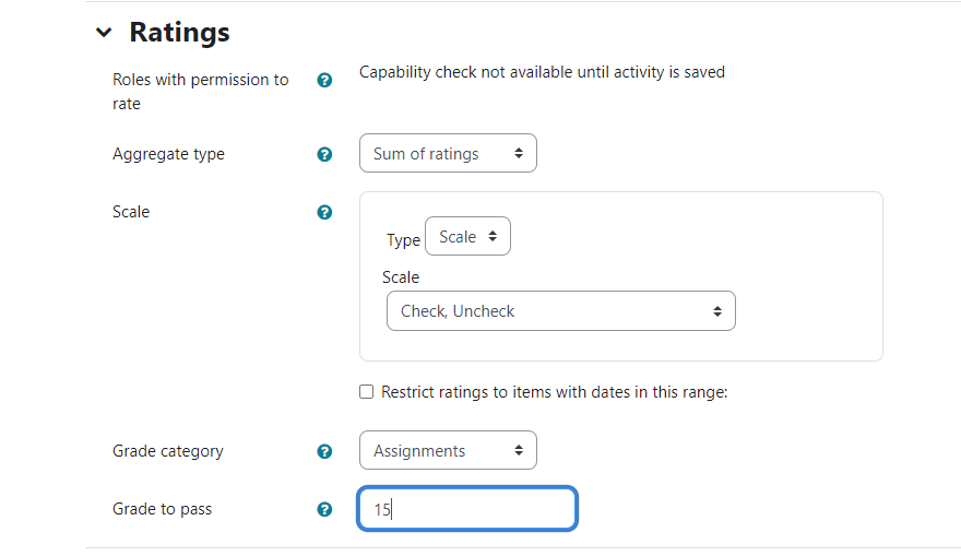 Under "Ratings," choose an Aggregate type. This is how your grades are computed. For more information on aggregate types see the entry on gradebook. For the purposes of this topic we will select "Sum of Ratings."