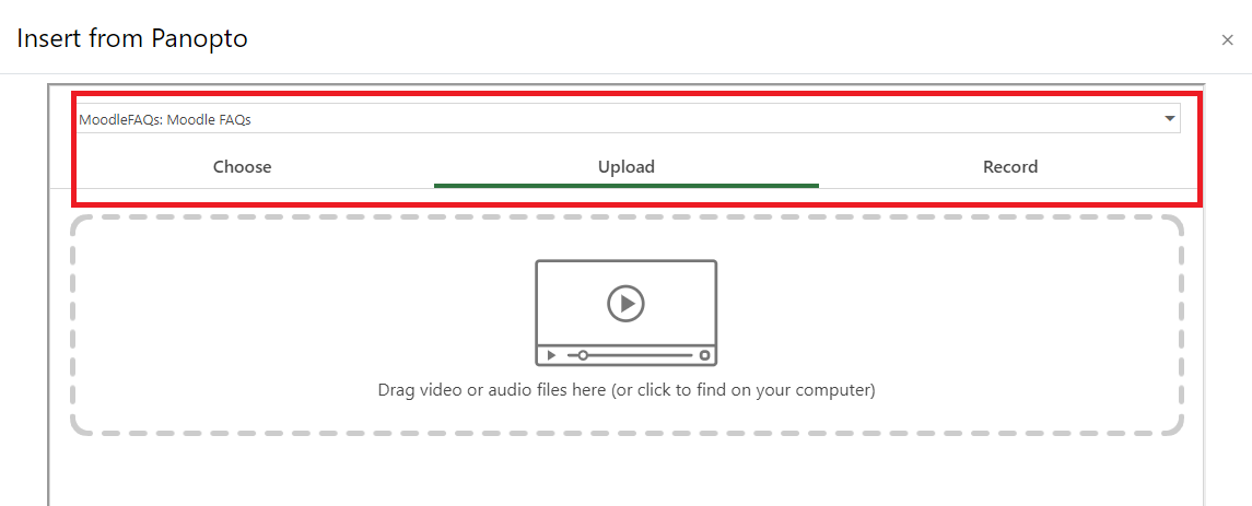 There will be times When you want to upload a video into Moodle that was not created using the Panopto recorder. Since Moodle has limited storage and does not have a way to handle viewing permissions other than the log-in, videos should be uploaded using the green Panopto button . There are a few things that you need to be aware of.