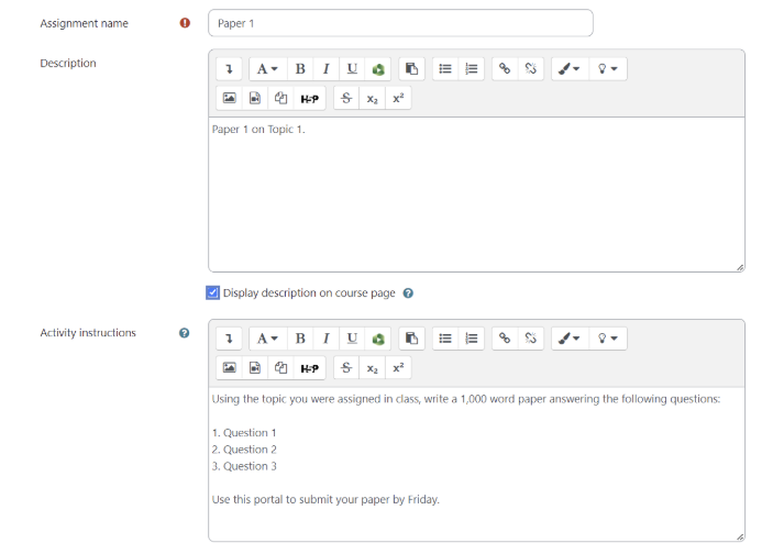 For more information on Assignments, take a look at MoodleUS's video below and documentation here.