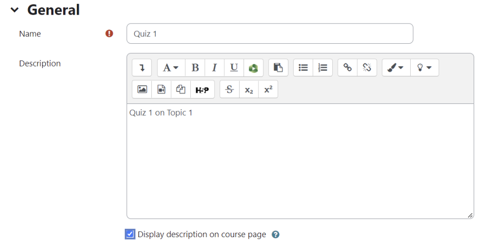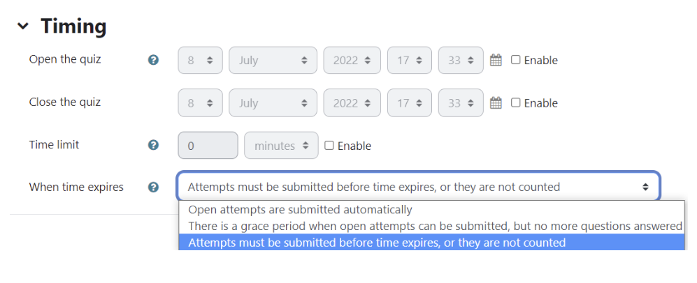 If you want a time limit to complete the quiz check the box to enable "Time limit" and type the number of minutes for the quiz.  There are options for seconds, hours, days and weeks.