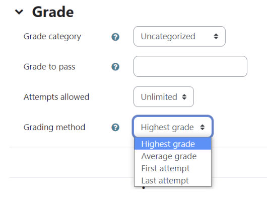 Grading method:  If allowing more than one attempt you can choose to grade the Highest, First attempt, Last attempt or the average of all attempts. default is Highest grade.
