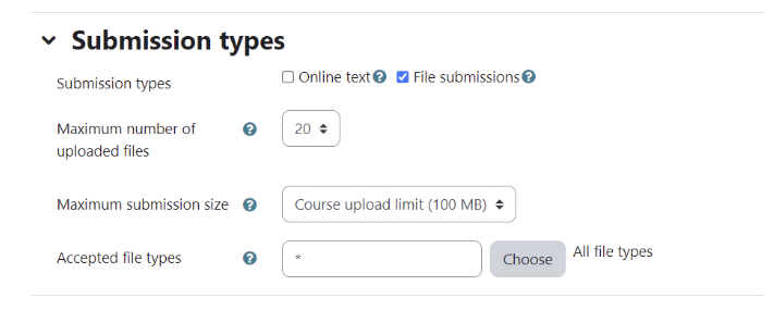 Submissions settings will allow you to dictate whether submissions should be a file submission (i.e. a Word document) or if they can enter text in the assignment area or both.